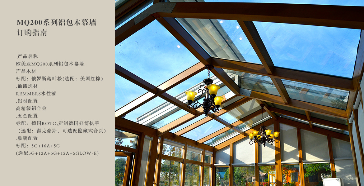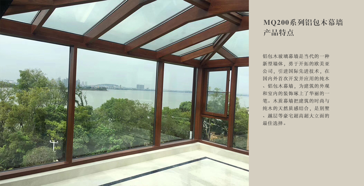 铝包木玻璃幕墙是当代的一种新型墙体,勇于开拓的欧美亚门窗公司引进德国先进技术,自主研发的铝包木幕墙窗为建筑的外观和室内的装饰琢上了华丽的一笔。